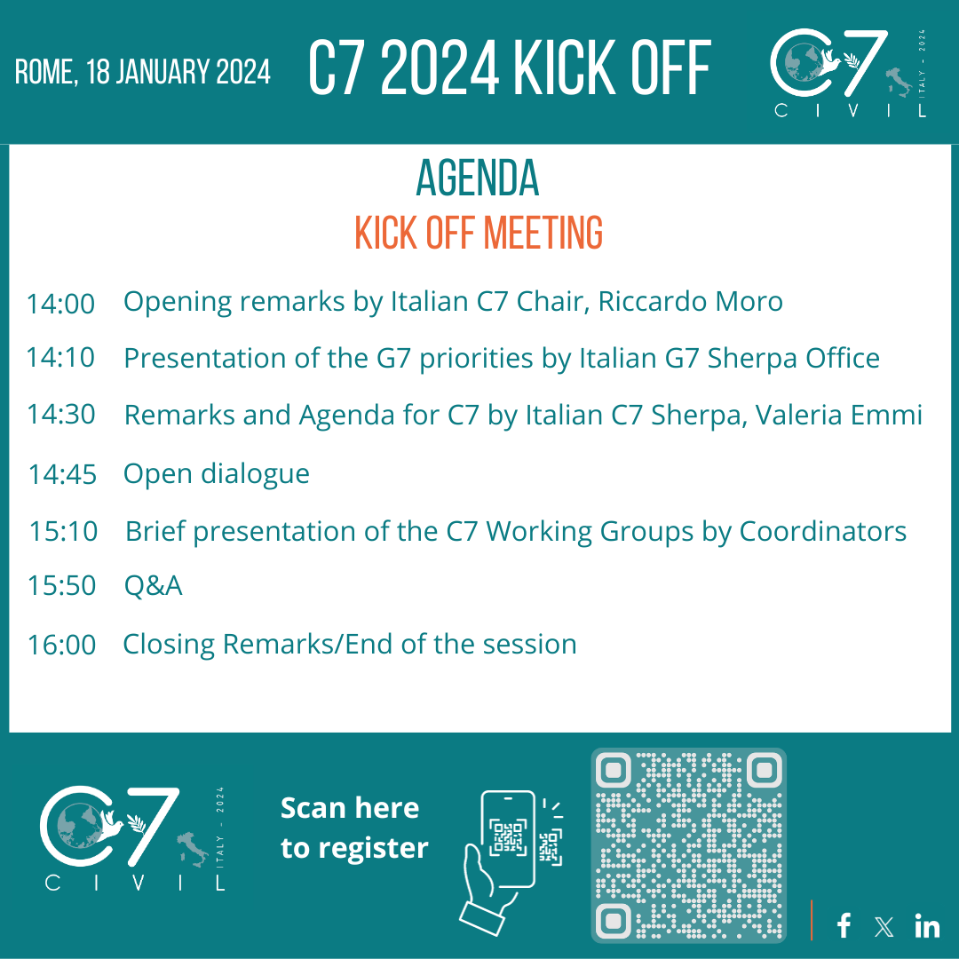 The Italian Civil Society Coalition is glad to announce that the C7 2024 kick-off meeting will be held in a hybrid mode (in person and virtually) on January 18th from 14.00 to 16.00 pm CET (GMT +1).