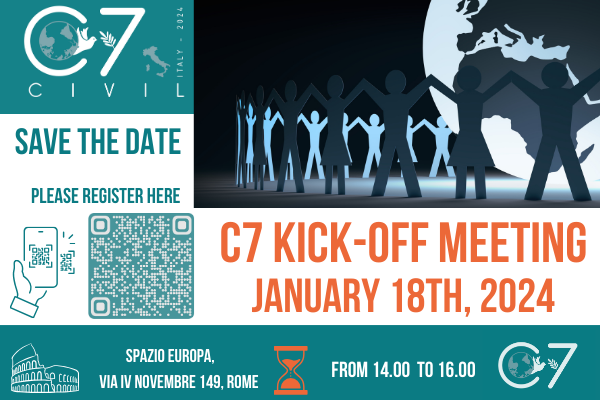 The C7 Kick-Off Meeting for civil society’s engagement during the Italian Presidency of the G7 will be held in Rome in a hybrid mode on January 18, 2024 and it represents the first official event of the C7 2024 process.