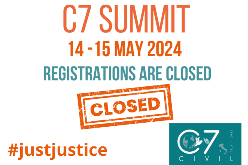 News Registrations to attend the C7 Summit in Rome on 14 and 15 May are officially closed Category: NewsBy c7AdminApril 22, 2024 Post navigation PreviousPrevious post:G7 Foreign Affairs Ministers’ Meeting: the Civil7 urges Ministers to incisive engagement to build a peaceful, just and secure futureNextNext post:C7: important signals, but still too much gas in the G7 Climate, Energy and Environment communiqué Related Posts G7 Ministers’ Meeting on Foreign Affairs: il Civil7 urges G7 for more clarity and action for peaceNovember 26, 2024 C7 Handover EventNovember 15, 2024 G7 Ministerial Meeting on Development: C7 calls for concrete financial commitments and focus on Official Development AssistanceOctober 24, 2024 C7 Statement ahead of the G7 Ministerial Meeting on DevelopmentOctober 17, 2024 International civil society calls for ambitious action for global health by the G7October 11, 2024 G7 Labour and Employment: concrete steps now to guarantee human rights and welfareSeptember 13, 2024